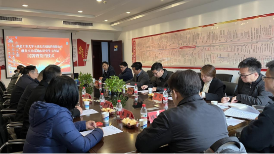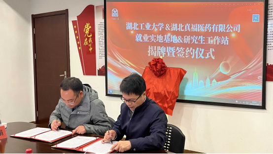 武漢真福創(chuàng)新生物制藥有限公司總經(jīng)理董艷山與湖工大生命科學(xué)與健康工程學(xué)院黨委書記王輝簽訂《碩士研究生聯(lián)合培養(yǎng)工作站協(xié)議書》。